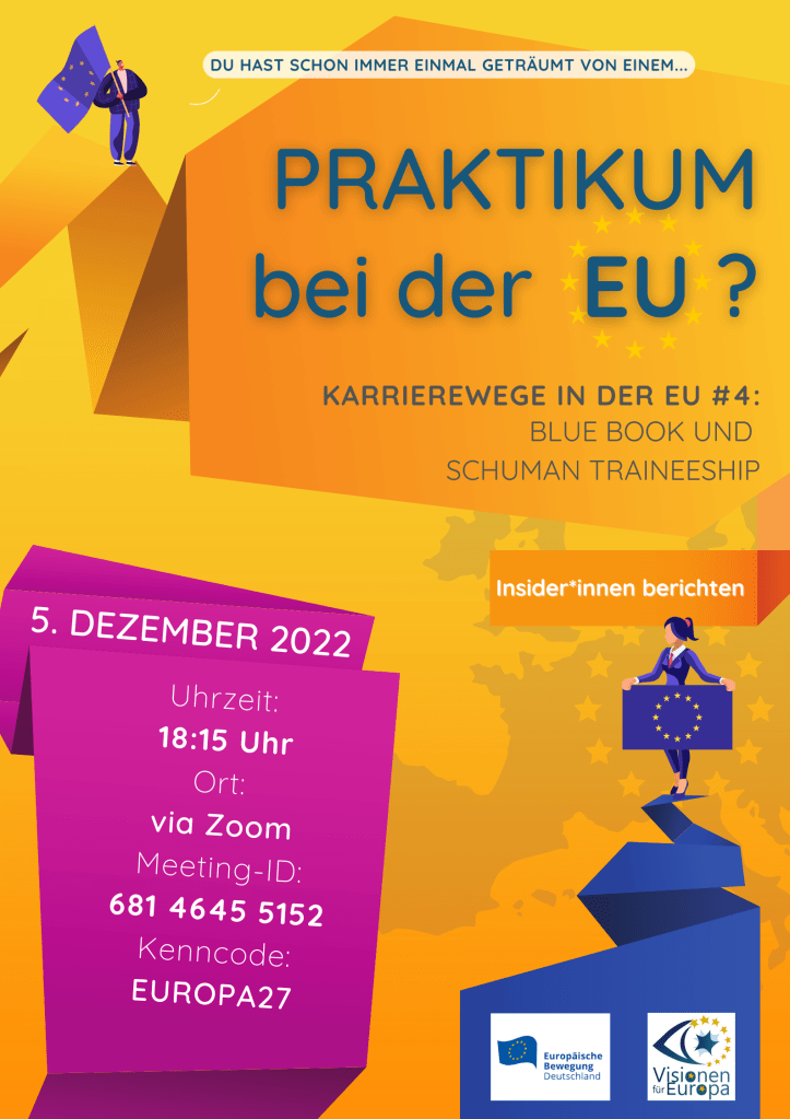 Ihr habt Lust, die EU und ihre Institutionen einmal von innen kennenzulernen und vielleicht sogar mal dort zu arbeiten? Dann habt Ihr am 05.12.2022 die Möglichkeit, Euch über Karrierewege in der EU zu informieren. Thematisch werden wir uns bei dieser Veranstaltung auf Praktika bei der Kommission und dem Parlament konzentrieren. Beginnen werden wir um 18:00 Uhr c.t. auf Zoom mit einer kurzen allgemeinen Einführung von Shiva Heitmann. Sie ist EU Careers Ambassador an der Universität Münster und damit vom EPSO (dem europäischen Amt für Personalauswahl) dazu zertifiziert, Studierende über die Karrieremöglichkeiten in der EU zu informieren. Allerdings sollen diese Ausführungen nicht zu theoretisch bleiben, deswegen werden wir zusätzlich noch zwei Praktikant*innen hören, die Euch aus erster Hand berichten können. Natürlich wird auch genug Zeit für all Eure Fragen bleiben.