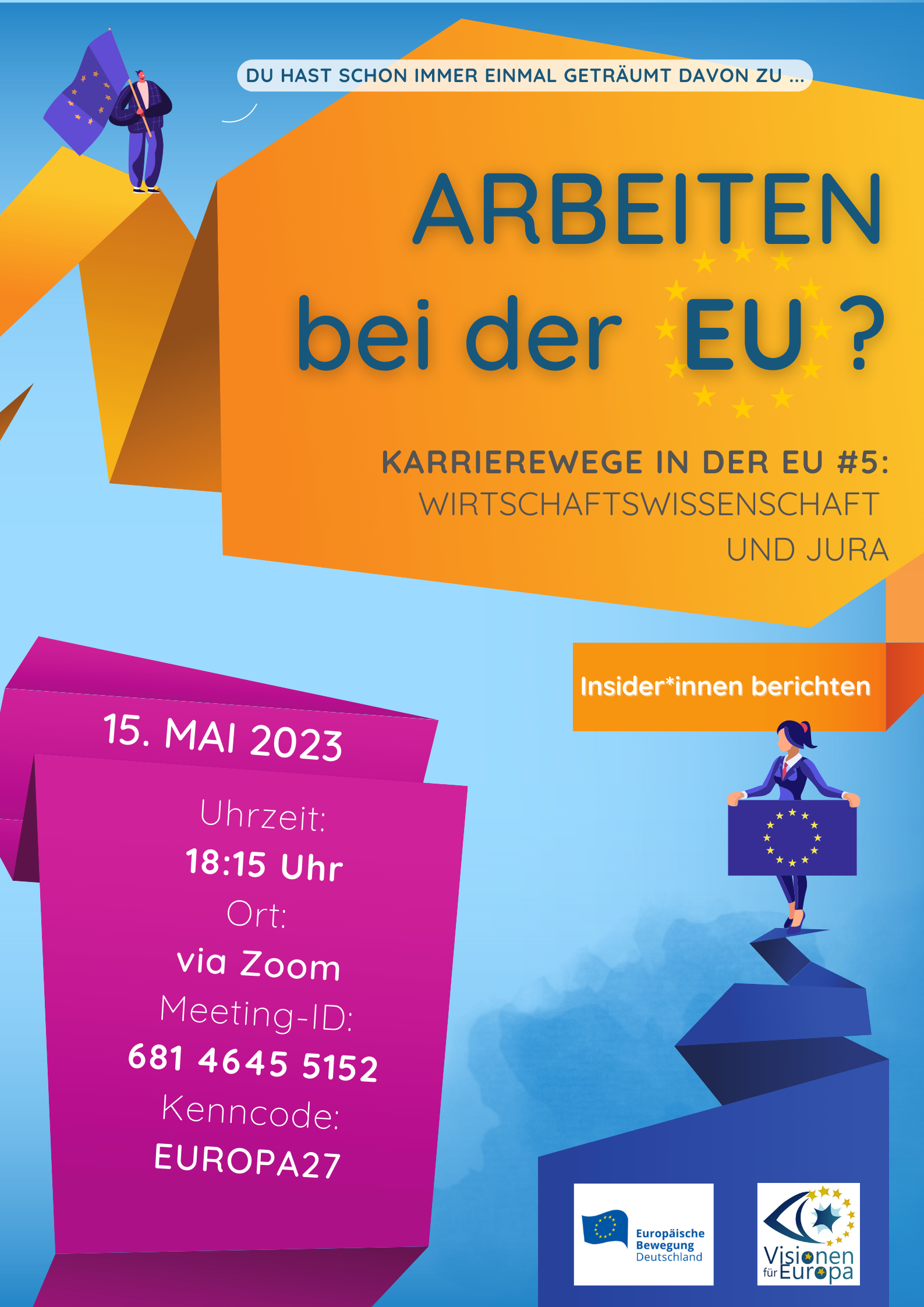 Ihr habt Lust, die EU und ihre Institutionen einmal von innen kennenzulernen und vielleicht sogar mal dort zu arbeiten? Dann habt Ihr am 15.05.2023 die Möglichkeit, Euch über Karrierewege in der EU zu informieren. Thematisch werden wir uns bei dieser Veranstaltung auf potenzielle Jobs als Wirtschaftswissenschaftler:in oder Jurist:in konzentrieren. Beginnen werden wir um 18:00 Uhr c.t. auf Zoom mit einer kurzen allgemeinen Einführung von Shiva Heitmann. Sie ist EU Careers Ambassador an der Universität Münster und damit vom EPSO (dem europäischen Amt für Personalauswahl) dazu zertifiziert, Studierende über die Karrieremöglichkeiten in der EU zu informieren. Allerdings sollen diese Ausführungen nicht zu theoretisch bleiben, deswegen werden wir zusätzlich noch zwei Expert:innen hören, die Euch aus erster Hand berichten können. Natürlich wird auch genug Zeit für all Eure Fragen bleiben.