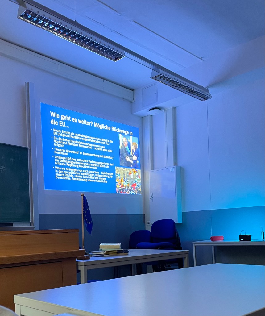Der Themenabend diente daher auch als Denkanstoß für uns, zu überlegen, welche Wege zurück in die EU es für Schottland gäbe. Ein Eintritt als eigenständiger von Großbritannien abgespaltener Staat erscheint schwierig, vor allem durch die Implikationen, die eine Anerkennung Schottlands als eigenständiges Land auf andere Unabhängigkeitsbestreben in der EU hätte, z. B. im Fall Katalonien. Ein ähnliches Handelsabkommen wie das mit Nordirland scheint unwahrscheinlich, genauso wie ein “Reverse Greenland”-Szenario, wie es beispielsweise schon für das britische Gebiet Gibraltar existiert. Außerdem können Unabhängigkeitsreferenden von der britischen Regierung geblockt werden. James wirbt daher für mehr Sichtbarkeit für die Lage der SchottInnen in Europa und auch Deutschland.