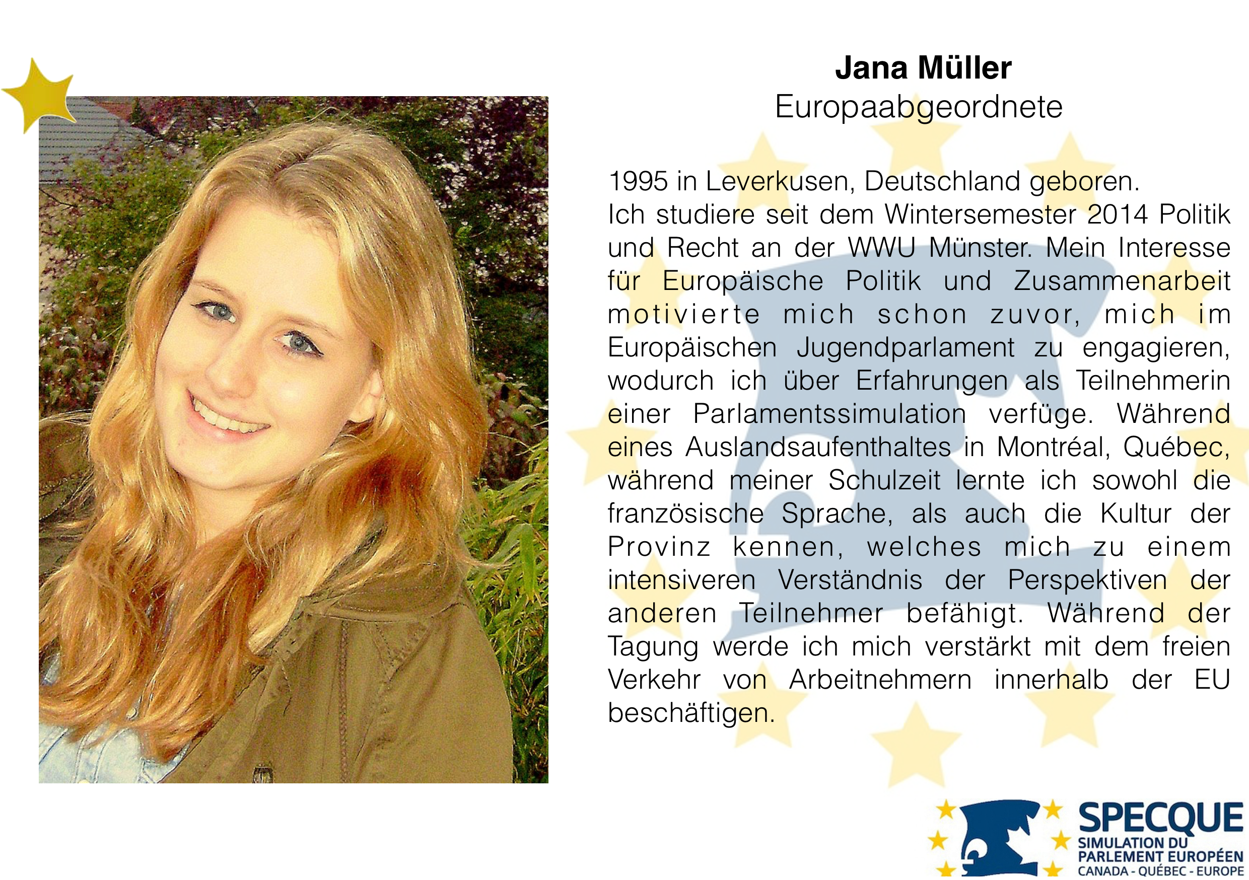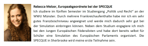 Im Sommer 2016 wird wieder ein Delegationsteam der Westfälischen Wilhelms-Universität Münster an der SPECQUE teilnehmen. Die Simulation des Europäischen Parlaments Kanada-Québec-Europäische Union findet dieses Jahr in Sherbrooke, Québec, Kanada statt.