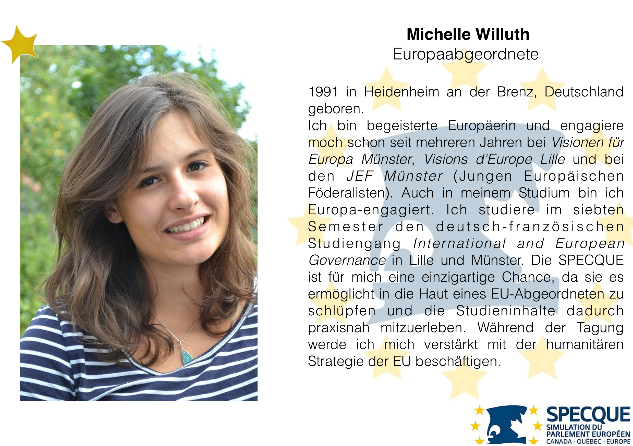 La SPECQUE, qu’est-ce que c’est? Die SPECQUE (Simulation du Parlement Européen Canada-Québec-Europe) ist die größte französischsprachige Simulation des Europäischen Parlaments der Welt. Sie wurde 1998 von Studierenden der Université Laval (Québec, Kanada) gegründet und hat sich auf beiden Seiten des Atlantiks als Referenz etabliert. Seit ihrer ersten Ausgabe verfolgt die SPECQUE ein doppeltes Ziel: die Kenntnis und die Ausstrahlung der europäischen Demokratie zu fördern und gleichzeitig den transatlantischen Austausch zwischen engagierten jungen Menschen anzuregen. Die Teilnehmenden haben die Möglichkeit für die Dauer einer Woche, den Alltag von Europaabgeordneten in Form einer Simulation näher kennen zu lernen. Sie können verschiedene Rollen einnehmen und sich unter anderem als Europaabgeordnete, Lobbyistin, Parlamentsjournalist, Kommissar, Berichterstatterin oder auch Parteivorsitzender beteiligen.